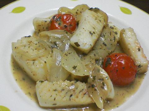 そこへイカを入れ、色が変わったらプチトマト・塩・コショウ・バジルソースを入れます。